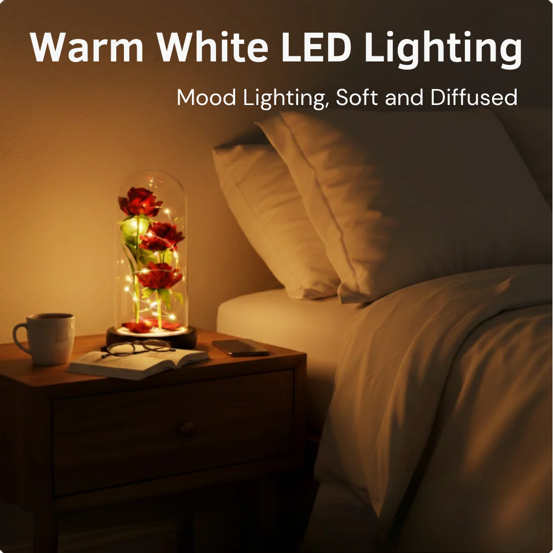 Wrapped delicately around the rose are 40 warm white LED micro-lights, casting a soft glow that fills the dome and gently spills into the surrounding space.
